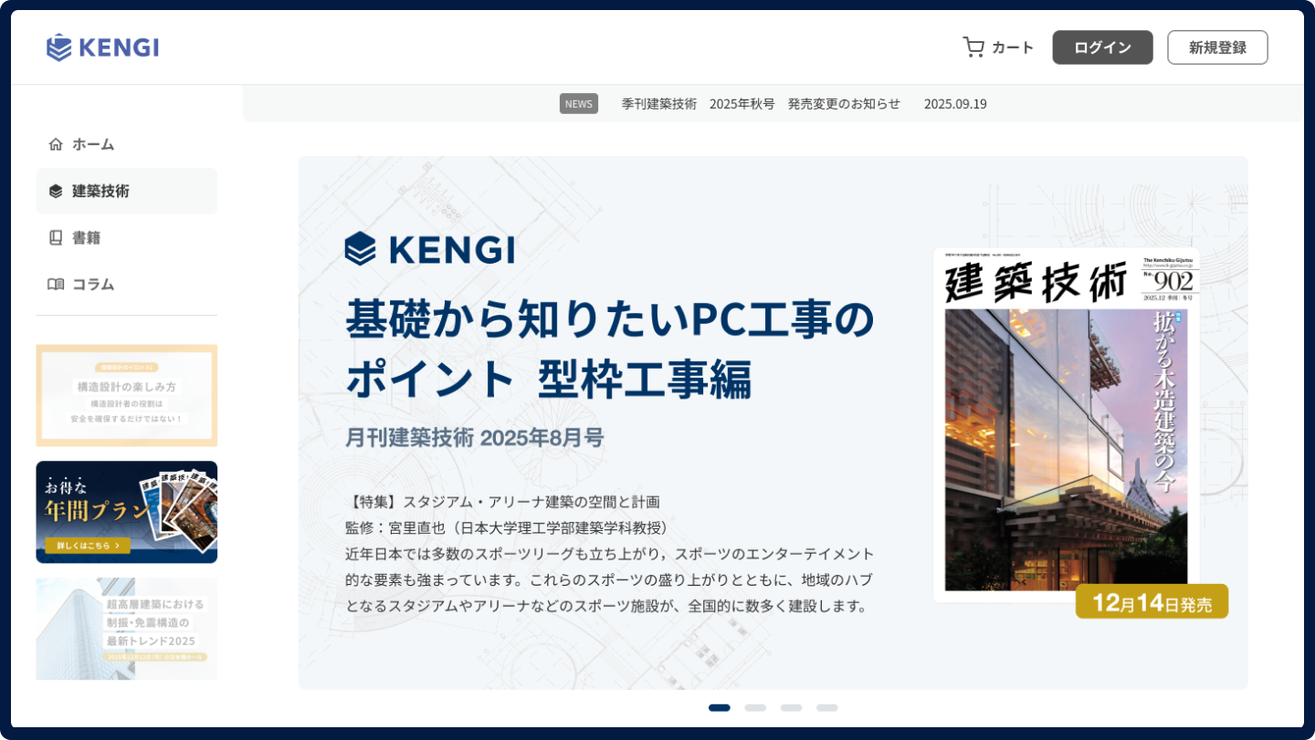 「KENGI」は、月刊「建築技術」をはじめとする建築技術の専門雑誌・書籍を購入できるECサイトとしての機能を備えています。75年以上にわたり蓄積された専門雑誌・書籍のラインナップを、いつでもどこからでもオンラインで閲覧・購入いただけます。また今後は雑誌・書籍の電子化を積極的に進め、検索性を高めた閲覧環境を提供してまいります。